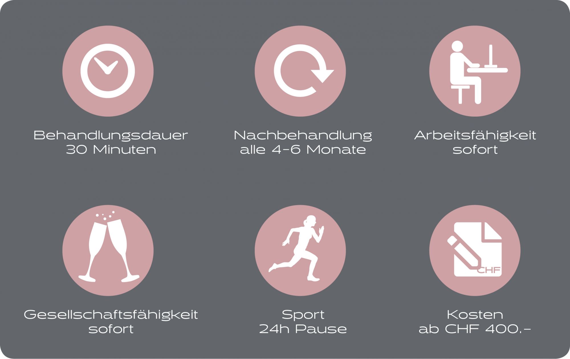 Das Botulinumtoxin wird mit einer Spritze und einer sehr feinen Nadel in die zu behandelnde Region injiziert. Dabei bestimmen wir in Absprache mit Ihnen, welche Muskeln kontrolliert werden sollen. Der Schmerz, welcher durch die Injektion verursacht wird, ist minimal, daher wird auf eine örtliche Betäubung verzichtet. Manchmal beschreiben Patienten ein leichtes Brennen, welches aber sofort nach der Injektion verschwindet. Selten kann es zu einem kleinen Bluterguss an der Einstichstelle kommen. Die Wirkung setzt nach 2-3 Tagen ein und der volle Effekt ist nach 7-14 Tagen sichtbar. Die Wirkungsdauer ist begrenzt und beträgt 4-6 Monate. Daher empfiehlt sich eine Wiederholung der Behandlung in 4-6 monatigen Abständen.